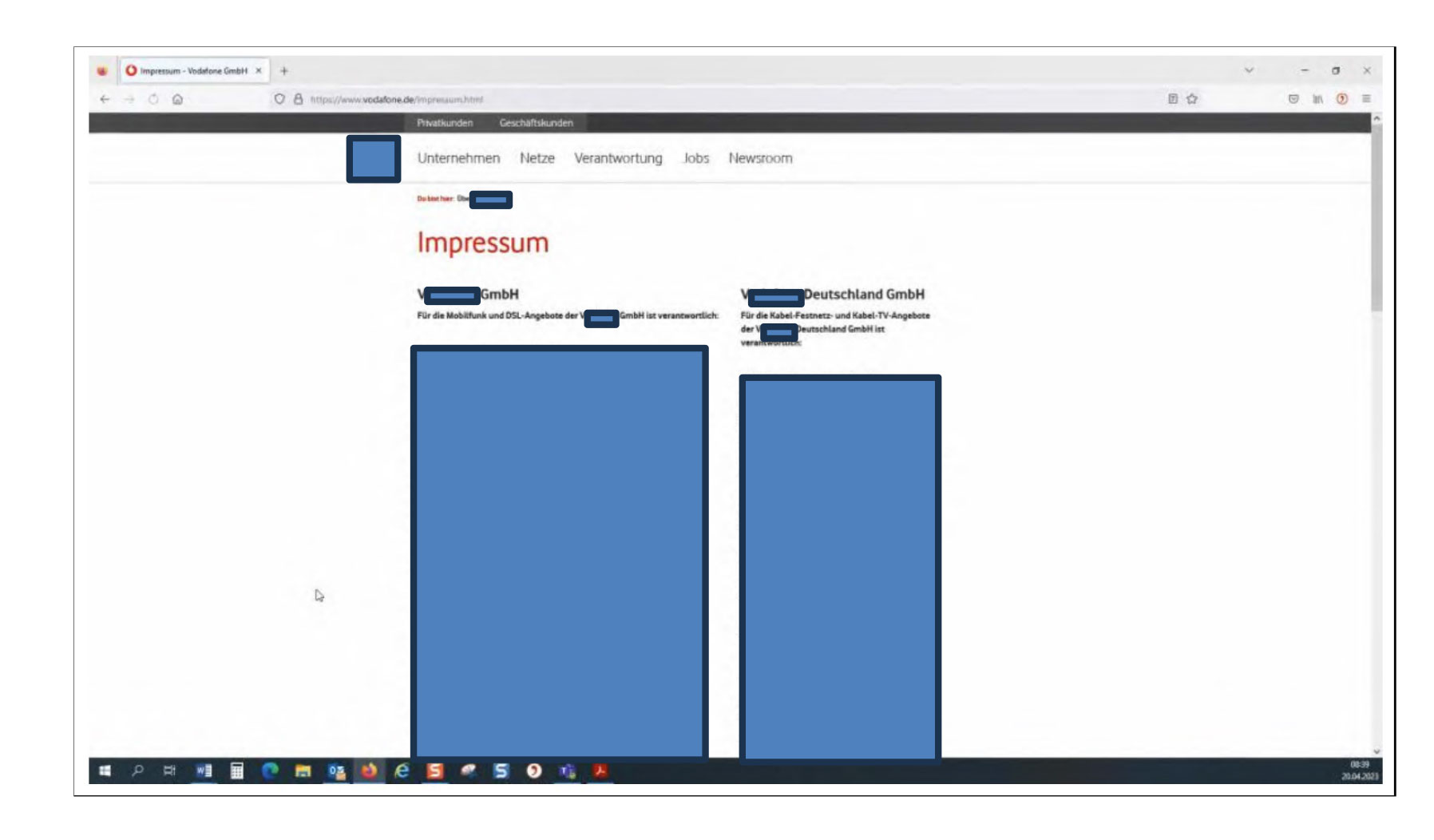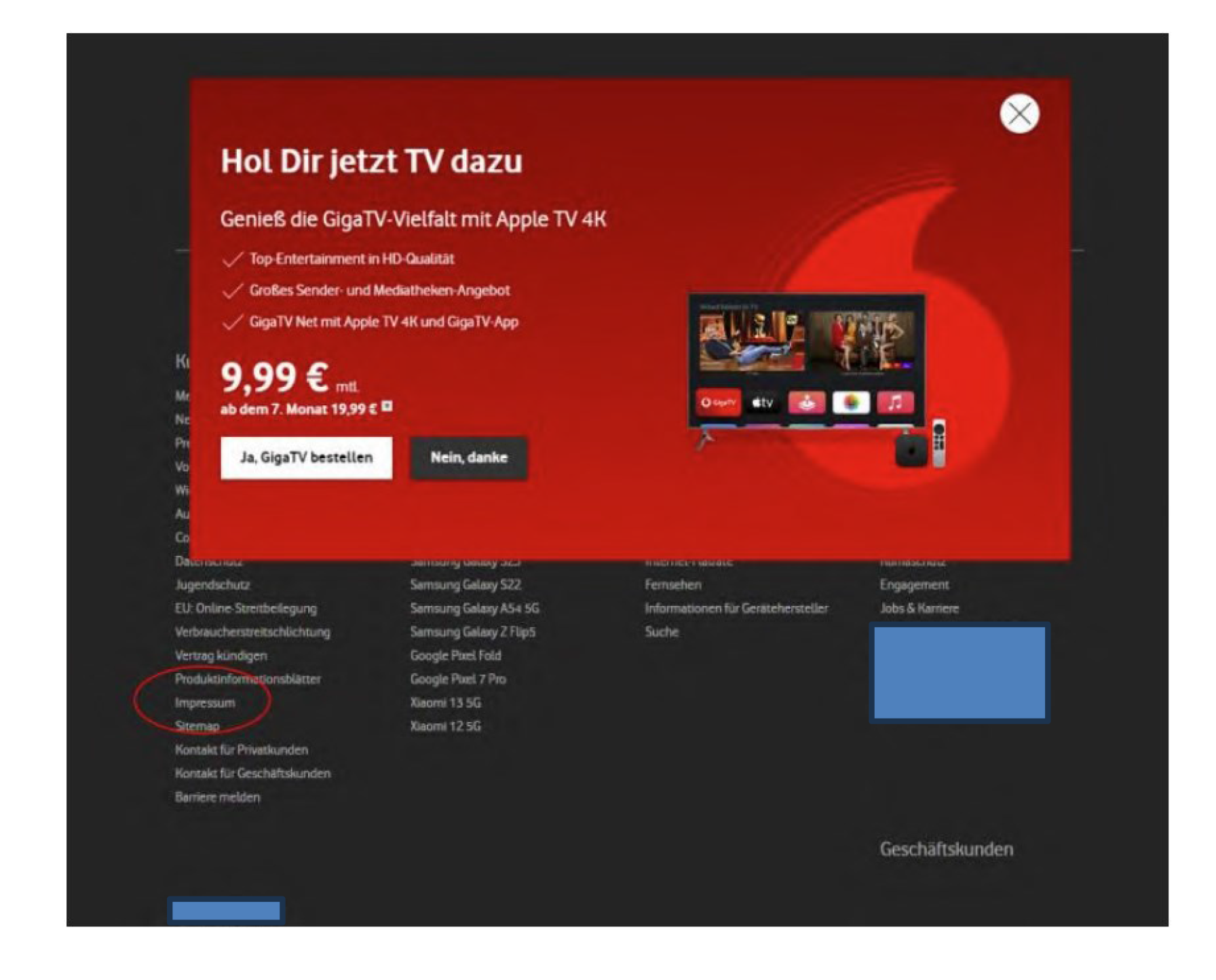 Dass Vertragspartnerin des Produkts „GigaTV Net inkl. Apple TV 4K“ die Beklagte ist, war im Zeitpunkt des Erscheinens des PopUp-Fensters nur über das Impressum der Internetseite www.v .de ersichtlich, welches von jeder Unterseite des Internetauftritts www.v .de aus und während des gesamten Bestellvorgangs abrufbar war: