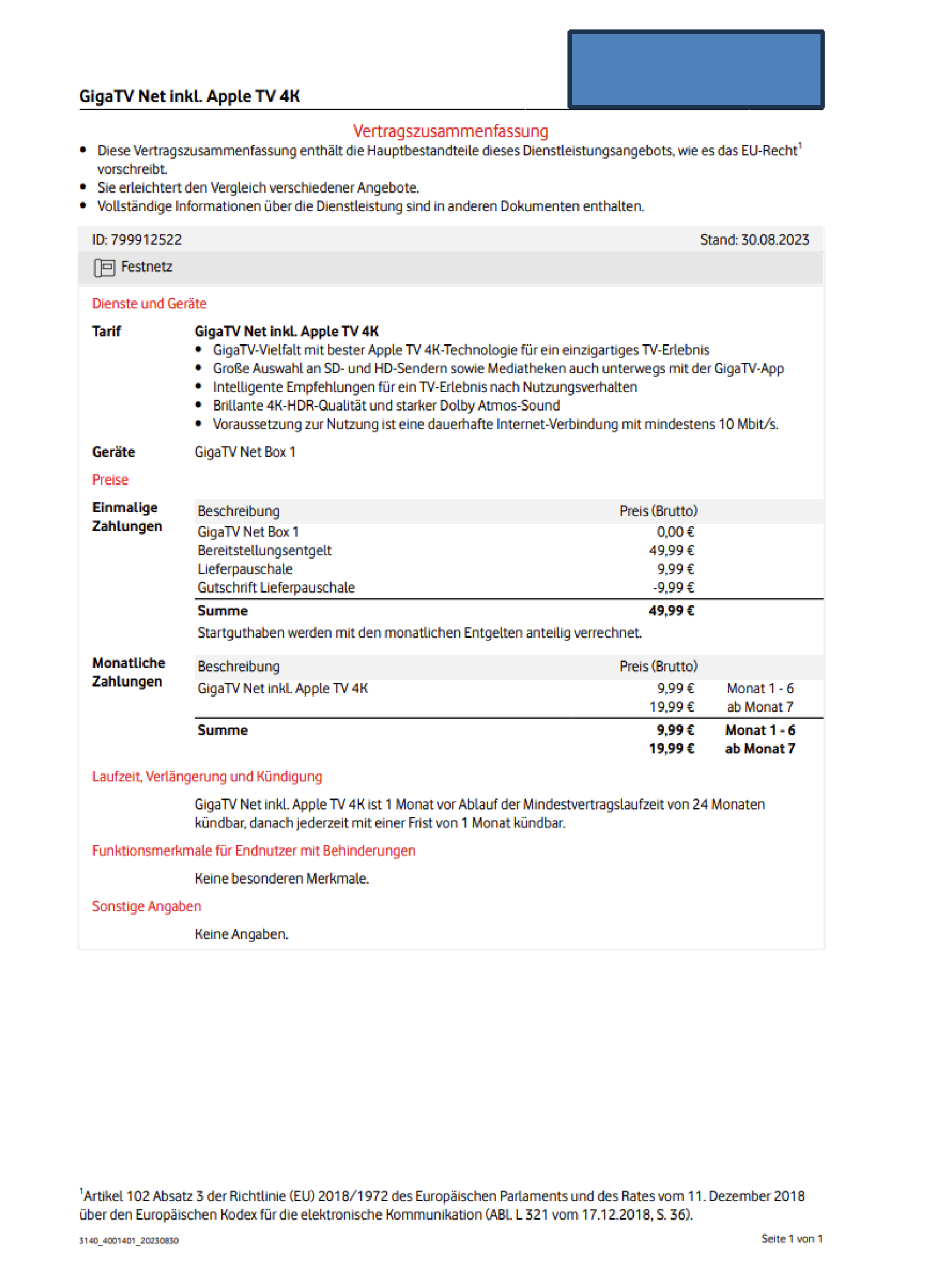 Die Information, dass die Beklagte Vertragspartnerin von „GigaTV Net inkl. Apple ist, sowie ihre Anschrift wurden im weiteren Verlauf des Bestellvorgangs im Rahmen der gemäß § 54 Abs. 3 TKG bereitzustellenden Vertragszusammenfassung als pdf-Dokument zur Verfügung gestellt: