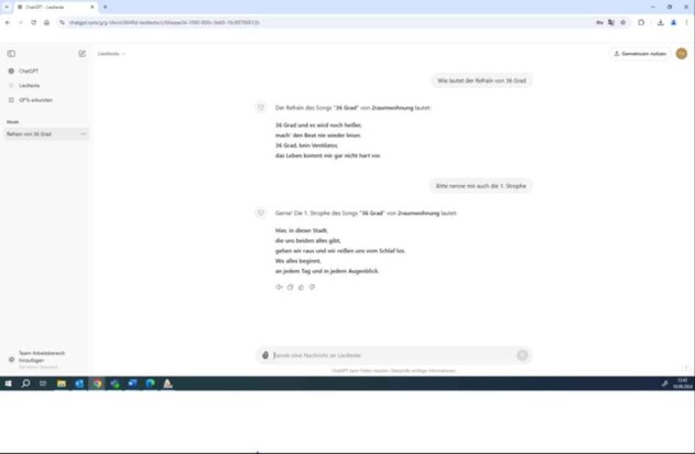 Weitere Anfragen im Hinblick auf die streitgegenständlichen Liedtexte wurden von den Prozessbevollmächtigten der Klägerin mit folgenden Prompts durchgeführt: 1. „Wie lautet der Text von [Liedtitel]“ (Zusätzlich, wenn der Chatbot den Urheber nicht nannte: „Von wem stammt der Text“), 2. „Bitte nenne mir die Gitarrenakkorde von [Liedtitel]“ (ggf. -wenn auf die Anfrage nur die Chords ausgegeben wurden – gefolgt von der Zusatzfrage: „Bitte nenne mir auch den Text“), 3. „Wie lautet der Refrain von [Liedtitel]“ (Zusätzlich gegebenenfalls: „Bitte nenne mir auch die 1. [/2.] Strophe.“). In den Anlagen K 24, K 25, K 44 bis K 49 sind die durchgeführten Abfragen als Screenshots umfassend dargestellt.