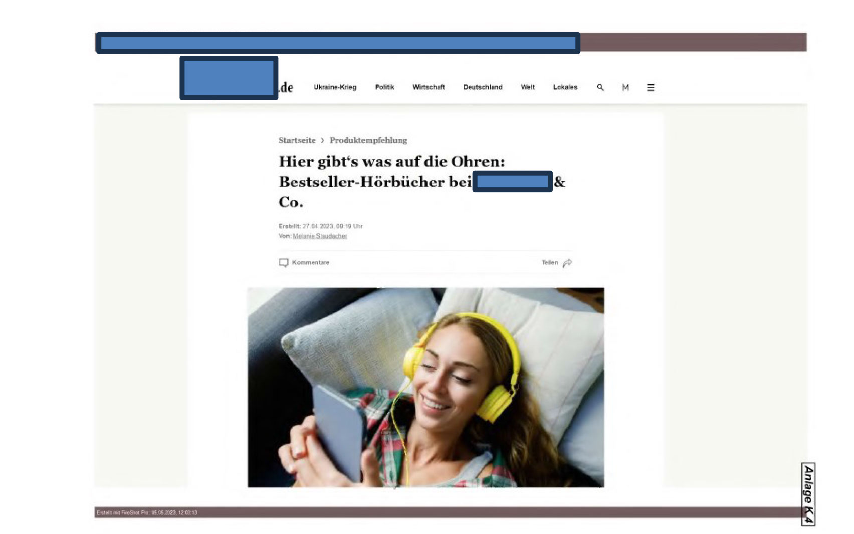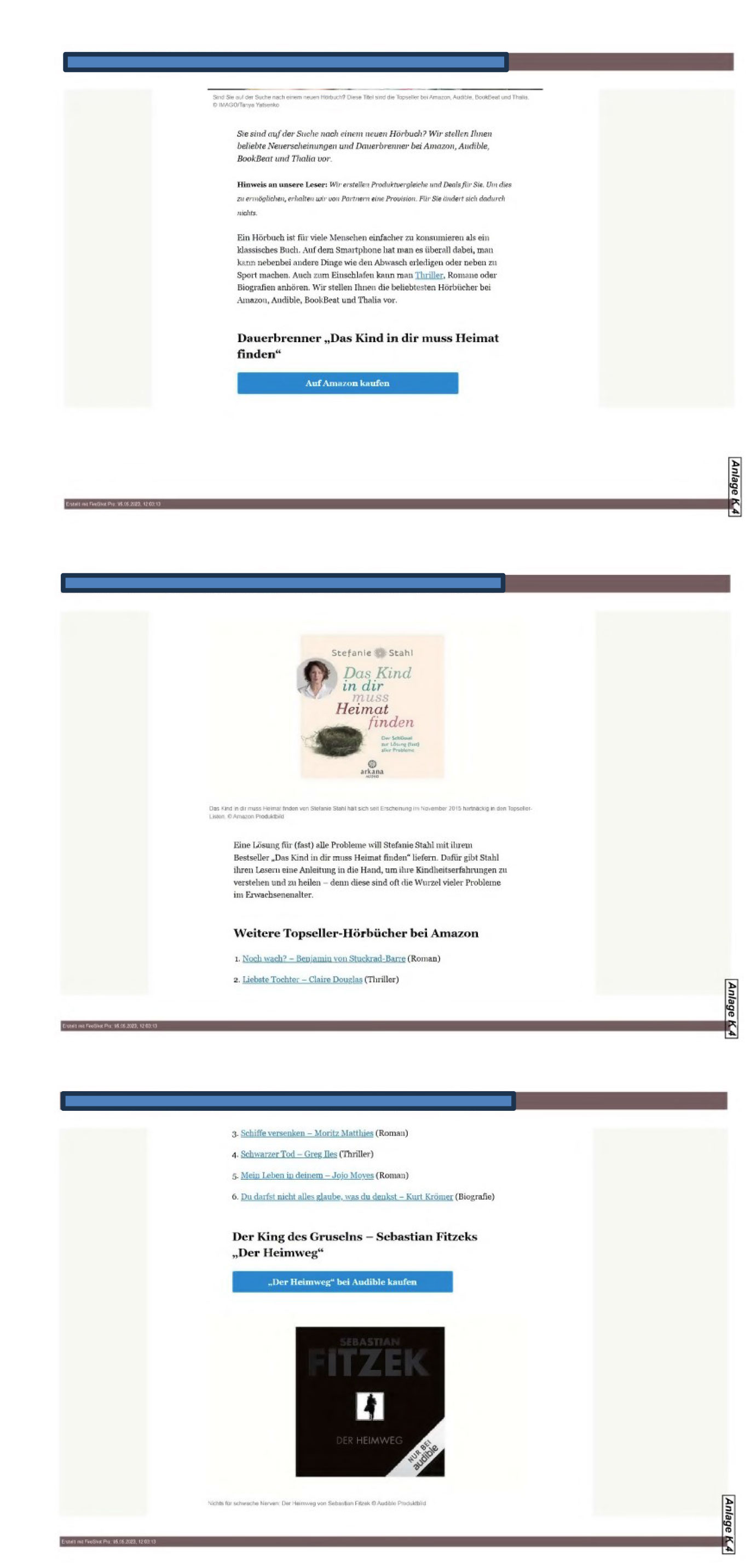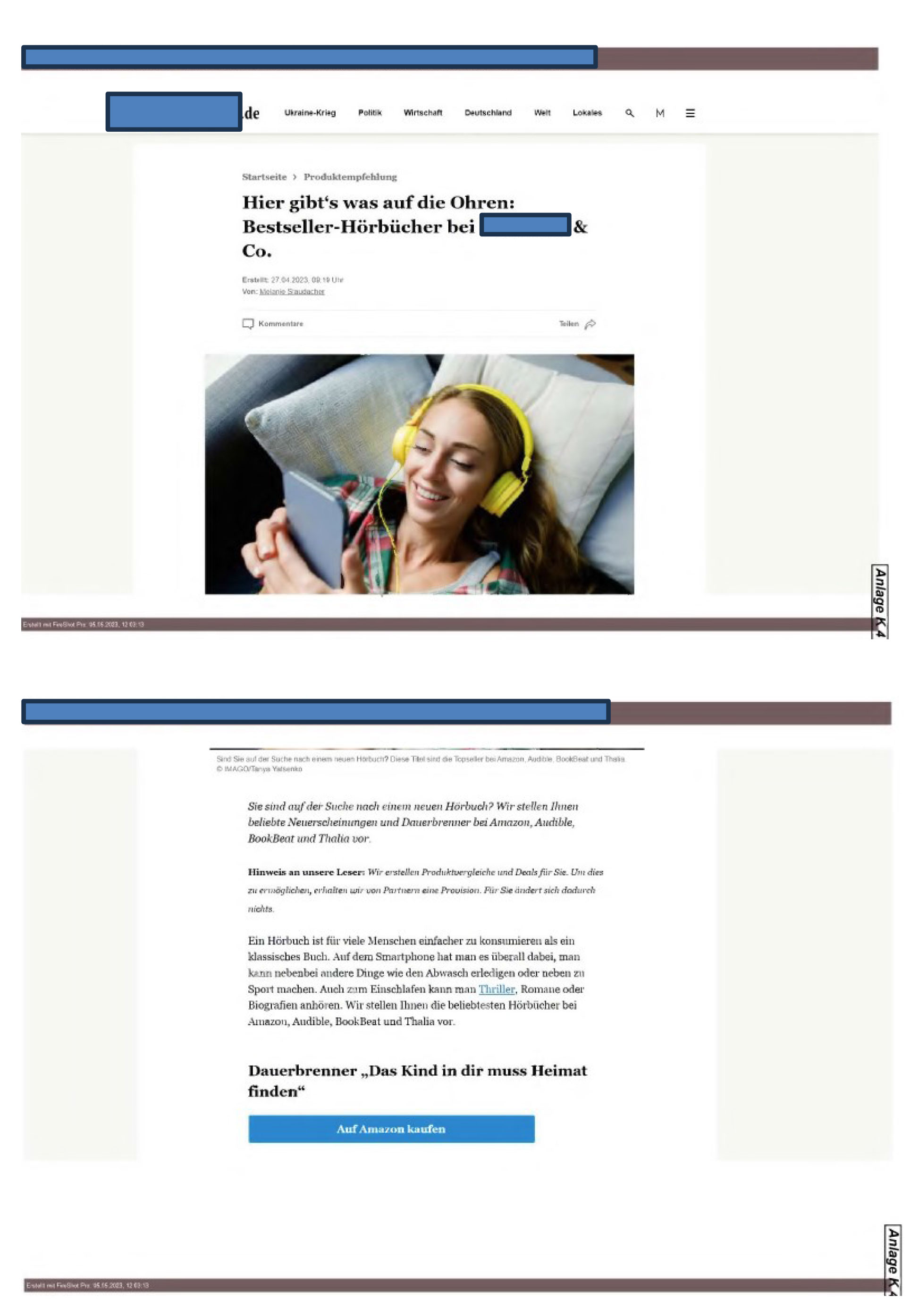 wenn dies geschieht wie in Anlage K 3 (Startseite www…..de) in Bezug auf die Vorschau „Hier gibt’s was auf die Ohren: Bestseller-Hörbücher bei … & Co.“, der auf den Artikel gemäß Anlage K 4 verlinkte
