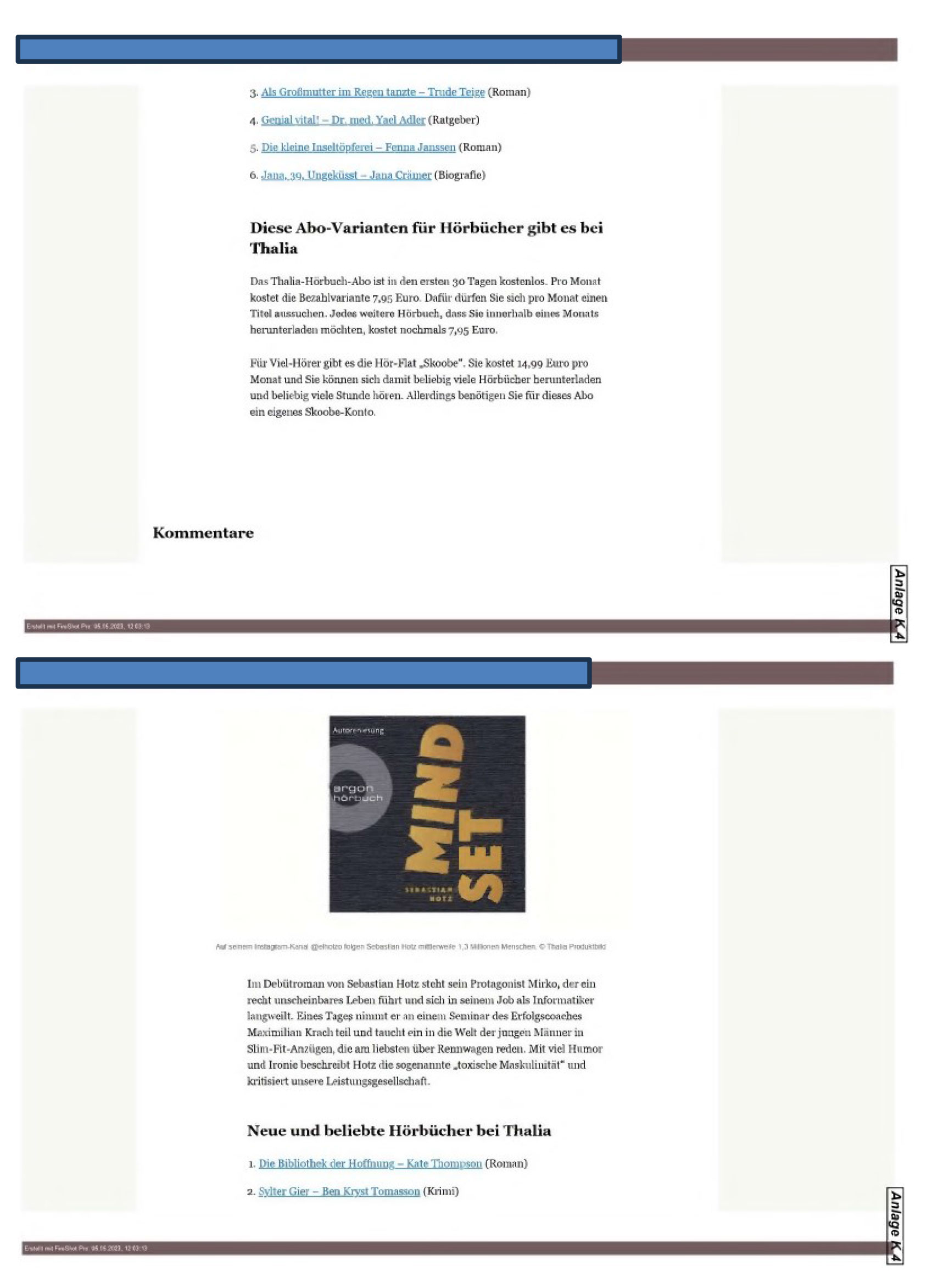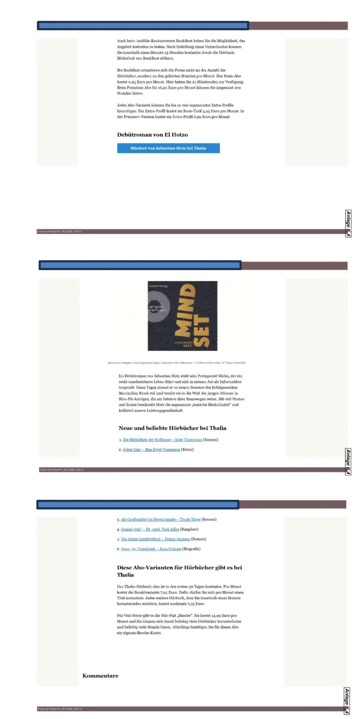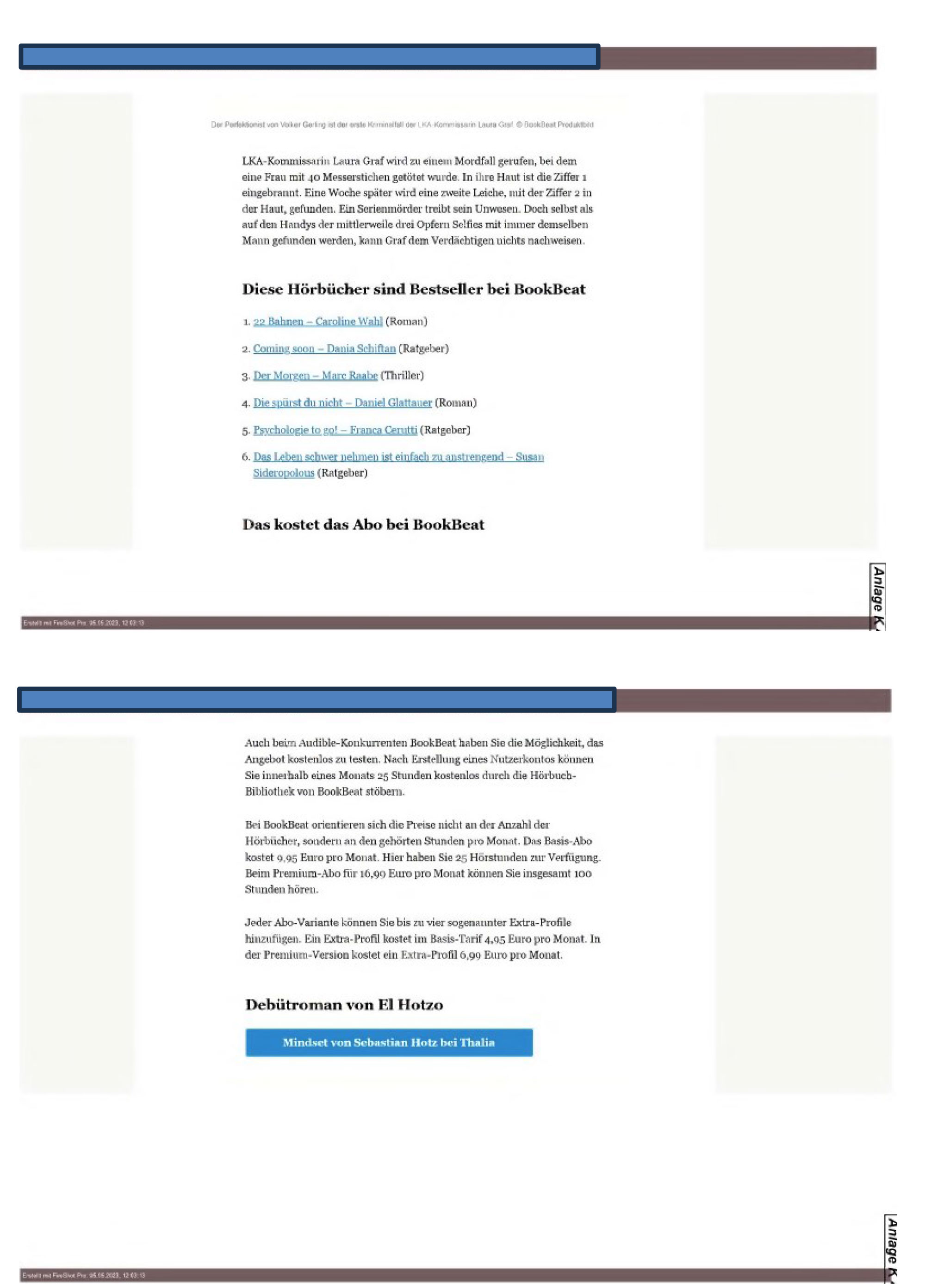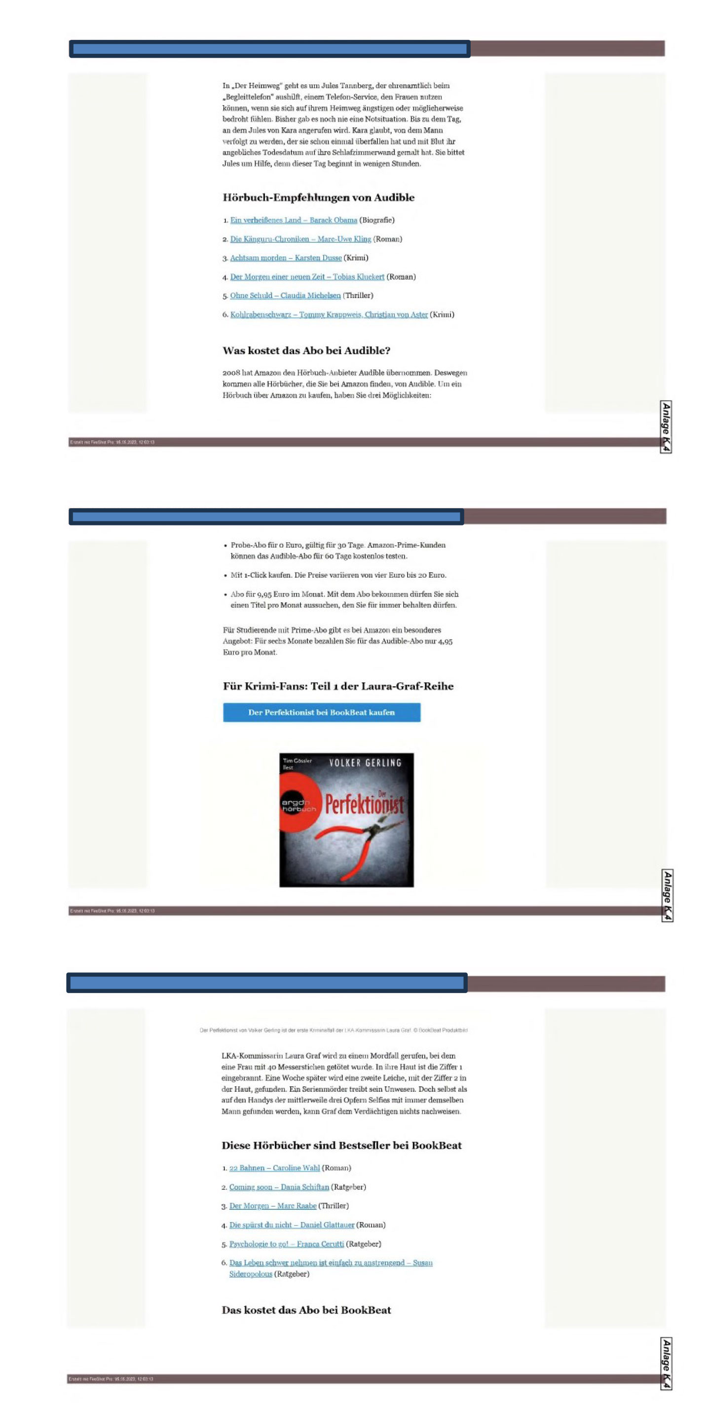 Die verlinkte Webseite „https://www…..de/produktempfehlung/hoerbuecher-bestseller-audible-bookbib-amazon-thalia-abo-kaufen-krimi-ratgeber-abo-kosten-zr-92231220.html!“ (Anlage K 4) stellt sich auszugsweise wie folgt dar: