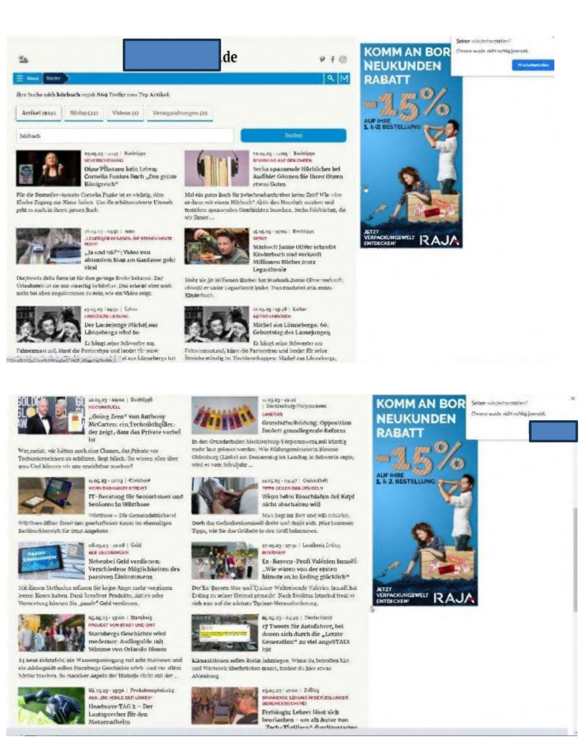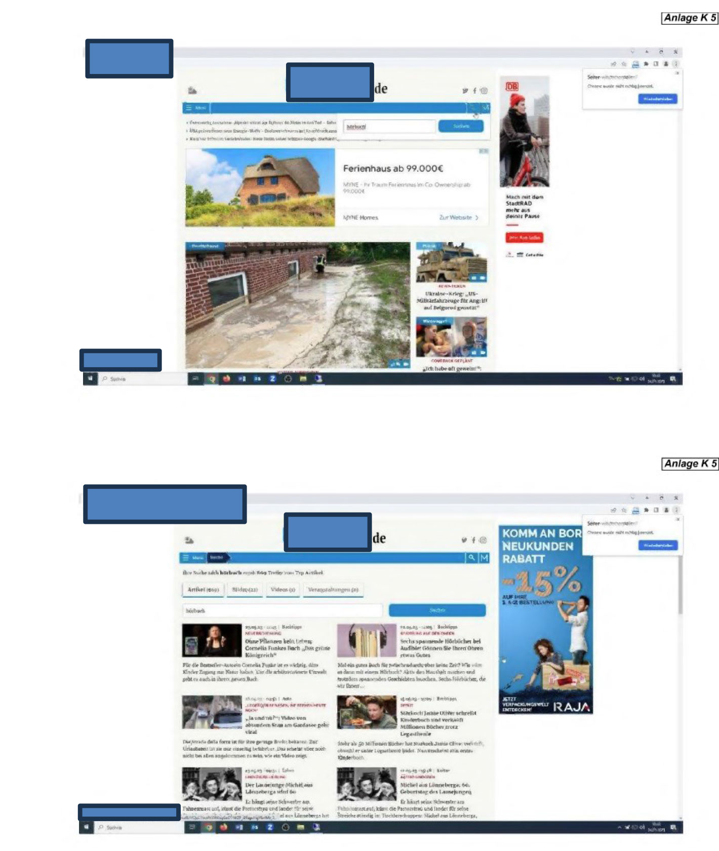 wenn dies geschieht wie in Anlage K 5 (Trefferseite Nutzung der Suchfunktion unter www. ….de) in Bezug auf die Vorschau „Hier gibt's was auf die Ohren: Bestseller—Hörbücher bei … & Co", welcher auf den Artikel gemäß Anlage K 4 verlinkte.