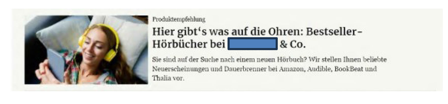 Nach dem Anklicken der nachfolgend eingeblendeten Vorschau gelangte man zu dem Artikel „Hier gibt's was auf die Ohren: Beststeller-Hörbücher bei … & Co“ auf der von der Beklagte zu 2) verantworteten Webseite „https://www…..de/produktempfehlung/hoerbuecher-bestseller-au-dible-bookbib-amazon-thalia-abo-kaufen-krimi-ratgeber-abo-kosten-zr-92231220.html!“ (Anlage K 4).