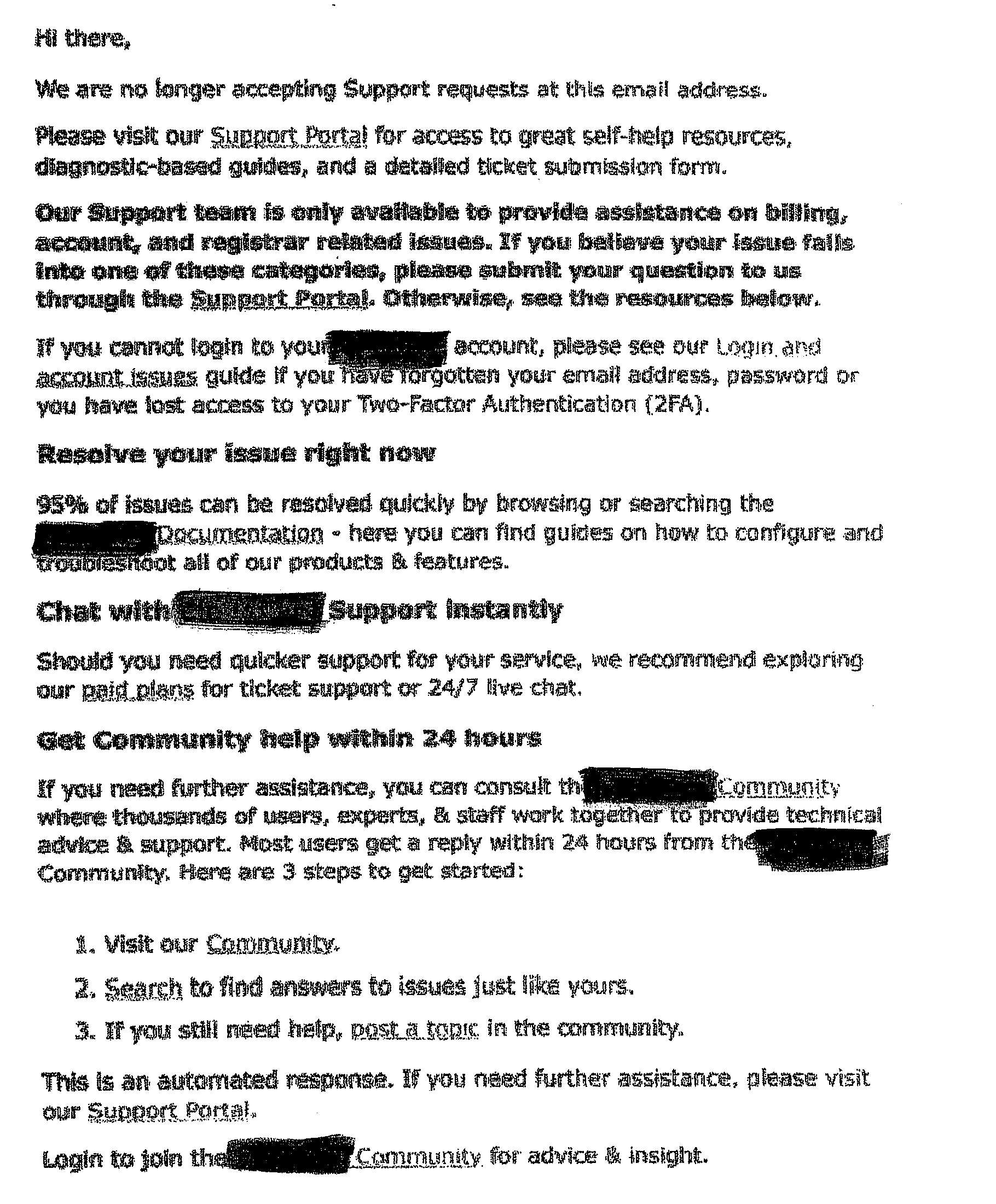 insbesondere wenn Anfrage an diese E-Mail-Adresse automatisch mit Angaben beantwortet werden wie „Hi there, We are no longer accepting Support request at this email adress. Please visit our Support Portal for access to great self-help resources, diagnostic-based guides, and a detailed ticket submission form.“, wenn dies geschieht wie in Anlage KR 2.