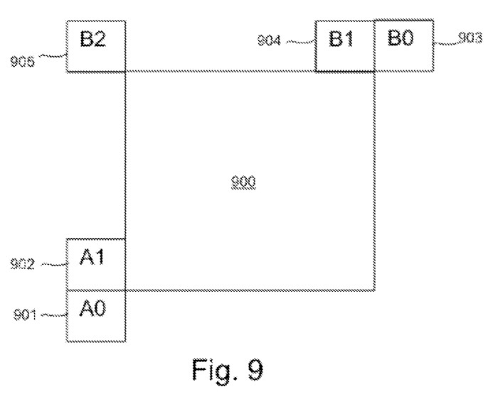 - der empfangene kodierte Block von Pixeln ist horizontal in eine erste Vorhersageeinheit und eine zweite Vorhersageeinheit geteilt, und wenn die Vorhersageeinheit die zweite Vorhersageeinheit ist, und der potenzielle räumlichen Bewegungsvektorvorhersagekandidat (902) hat dieselben Bewegungsvektoren und dieselben Referenzindizes wie der räumliche Bewegungsvektorvorhersagekandidat (904) über der Vorhersageeinheit;