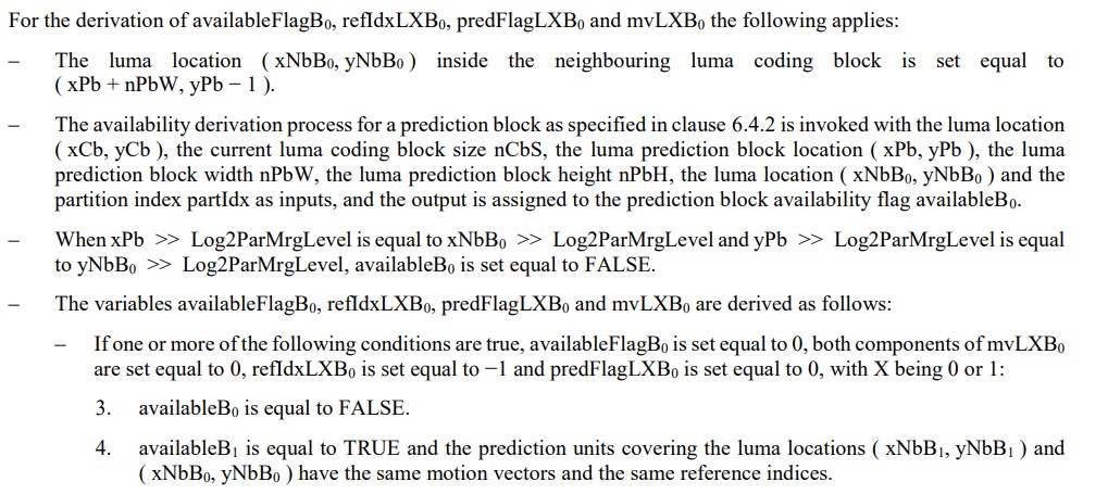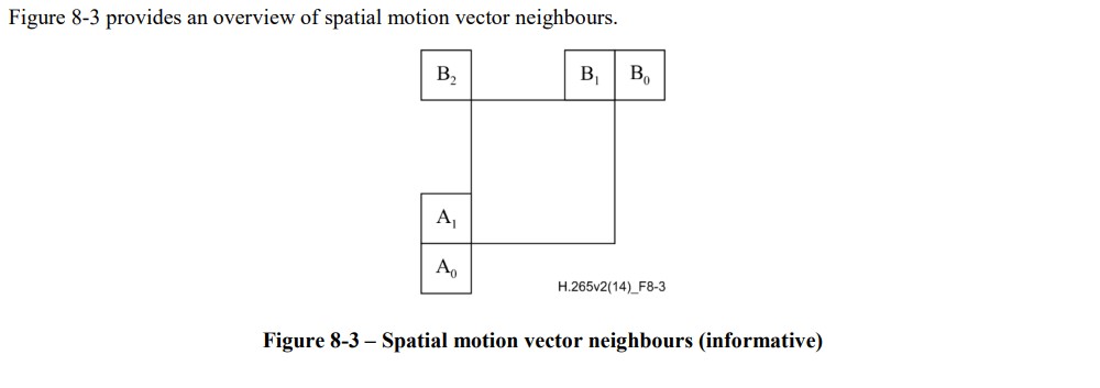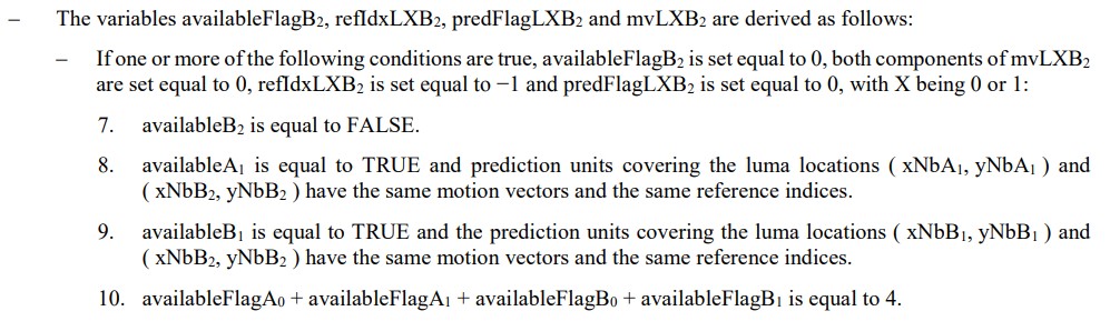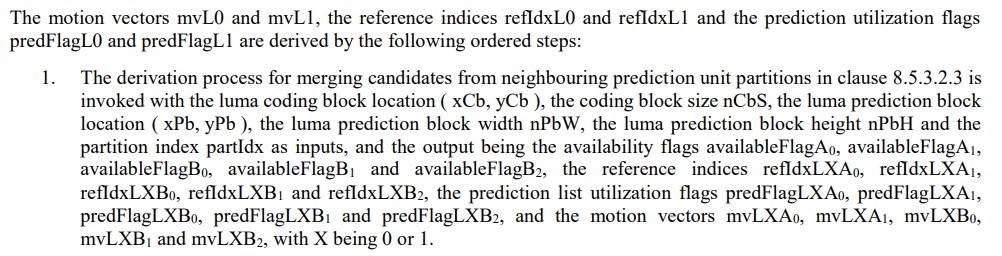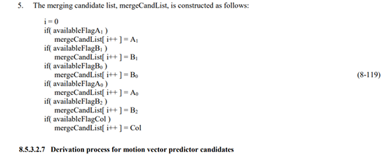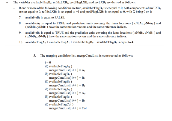 Nach dem Vorschlag der KWY 9a werden zunächst mehrere Vergleiche zwischen Raumbewegungsvektorvorhersagekandidaten im Hinblick auf deren Bewegungsinformationen durchgeführt (siehe Abschnitt 8.4.2.1.2 der KWY 9a; dies steht in merklichem Gegensatz zur Begrenzung der Kandidaten auf S0 und S1 in der KWY 9). Dabei entscheiden die Vergleiche über die vorläufige Zusammensetzung der Merge-Liste. Jene wird gemäß Nr. 4 von Abschnitt 8.4.2.1.1 der KWY 9a in einer festen Reihenfolge zusammengestellt: wenn der Raumbewegungsvektorvorhersagekandidat links vom zu dekodierenden Pixelblock (bezeichnet mit „A“) verfügbar ist, kommt er an erster Stelle; an zweiter Stelle kommt gegebenenfalls der Raumbewegungsvektorvorhersagekandidat oberhalb des zu dekodierenden Pixelblocks („B“), usw.