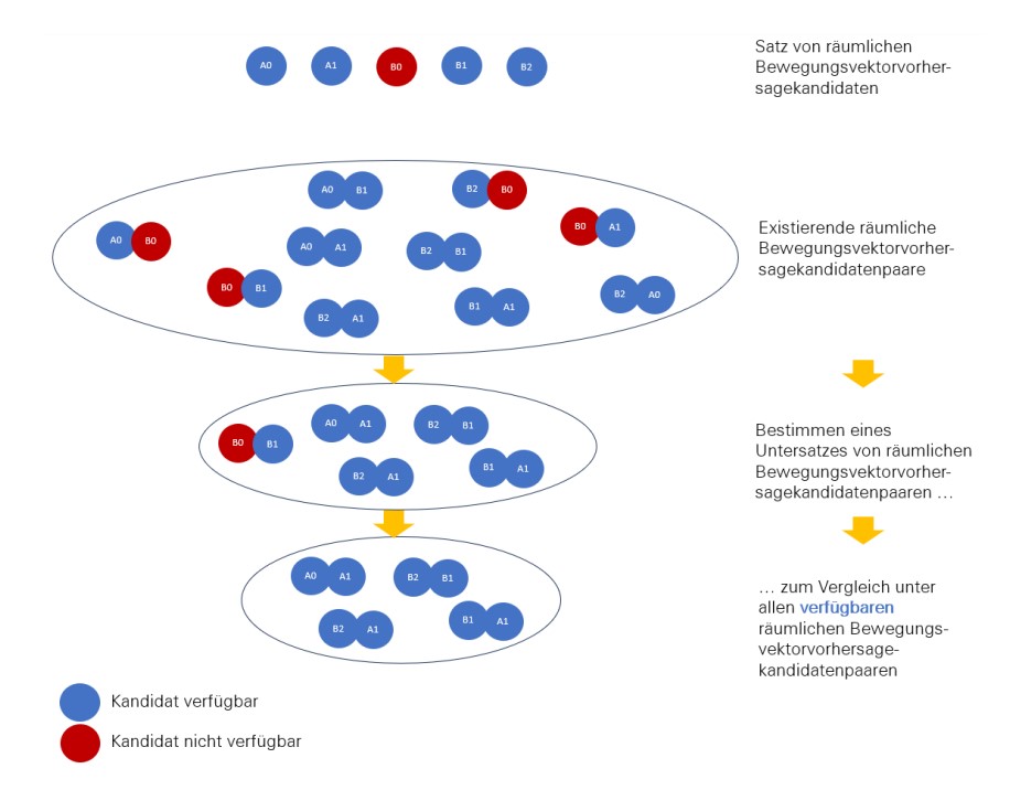 Damit offenbart die KWY 9 die Auswahl eines Untersatzes an Raumbewegungsvektorvorhersagekandidaten bestehend nur aus einem Paar. Merkmal 6.4 lehrt aber das Bestimmen eines Untersatzes von Raumbewegungsvektorvorhersagekandidatenpaaren. Das ist auch nicht lediglich eine semantische Feinheit. Denn die Bildung eines Untersatzes bestehend aus mehreren Paaren, aus denen dann die Raumbewegungsvektorvorhersagekandidaten ausgewählt und mit ihrem Partner verglichen werden, erhöht die Vorhersagequalität gegenüber der Untersuchung von nur zwei Raumbewegungsvektorvorhersagekandidaten. Das gilt umso mehr als die beiden nach der KWY 9 auszuwählenden Raumbewegungsvektorvorhersagekandidaten S0 und S1 nach keinem besonderen Muster ausgewählt werden sollen (siehe „Notes“ am Ende des Abschnitts 2.2.1, wonach es sich um den ersten bzw. zweiten „gefundenen“ Raumbewegungsvektorvorhersagekandidaten handeln soll). Das Klagepatent nennt diesen Nachteil in Abs. [0018] bei der Diskussion der KWY 9 explizit („It may happen that one or both of the selected two spatial predictors are not the best alternatives.”)