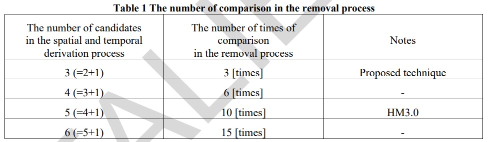 Die Tatsache, dass in der abgebildeten Tabelle unterhalb der ersten Zeile, die den Vorschlag der Autoren der KWY 9 enthält, noch andere Optionen genannt werden, führt nicht dazu, dass die KWY 9 diese anderen Optionen eindeutig und unmittelbar offenbart. Denn die KWY 9 beschränkt den Vorschlag explizit auf die Auswahl nur zweier Raumbewegungsvektorvorhersagekandidaten, in Abgrenzung zum bestehenden Stand der Technik.