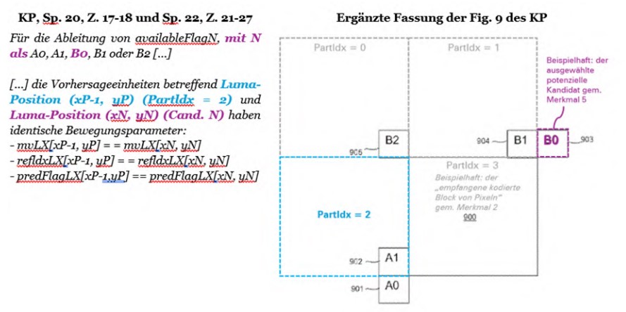 Die KWY 9 offenbart nur die Vergleiche zwischen den beiden Raumbewegungsvektorvorhersagekandidaten S0 und S1, wobei offenbleibt, an welcher Stelle relativ zum zu dekodierenden Pixelblocks sich S0 und S1 befinden. Dieser Vergleich entspricht funktionell Merkmal 6.7. Die Merkmale 6.10.1 bis 6.10.5 lehren demgegenüber eine Begrenzung der Merge-Liste basierend darauf, dass – anhand ihrer Position relativ zum zu dekodierenden Pixelblock – konkret benannte Raumbewegungsvektorvorhersagekandidaten weiteren Vergleichen mit anderen Kandidaten unterzogen werden.