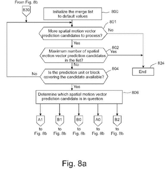 Fig. 8 der KWY 7 betrifft ein Verfahren, bei dem ein zu dekodierender Pixelblock X zusammengeführt („merged“) wird, indem Bewegungsinformationen von Kandidaten aus den benachbarten Blöcken D, A, E, B und C erlangt werden (Abs. [0098]). In diesem Kontext finden auch nach der KWY 7 Vergleiche zwischen bestimmten benachbarten „Zusammenführungsbewegungskandidaten“ („merge motion candidates“) statt mit der Folge, dass ein Kandidat im Falle identischer Bewegungsinformationen zwischen ihm und dem Vergleichskandidaten nicht in die Merge-Liste aufgenommen wird (siehe Abs. [0101], [0111] f. der KWY 7). Allerdings werden diese Vergleiche solange durchgeführt, bis am Ende feststeht, dass jede Bewegungsinformation nur einmal vorhanden ist; nur ein Kandidat pro Bewegungsinformation kann in der Merge-Liste verbleiben (siehe Abs. [0102]).