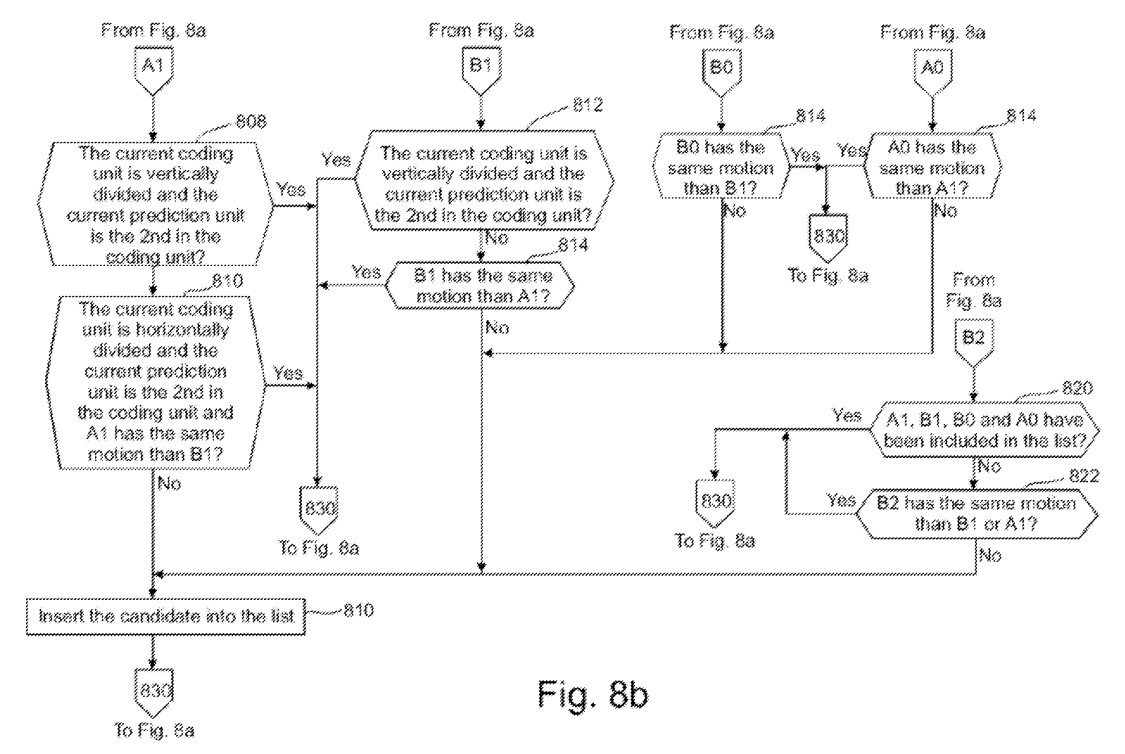 - unmittelbare Verletzung von Anspruch 10 in Verbindung mit Anspruch 7 – insbesondere, wenn das Verfahren nach Anspruch 6 oder 7 das Überprüfen, ob der empfangene kodierte Block von Pixeln in eine erste Vorhersageeinheit und eine zweite Vorhersageeinheit in Dekodierreihenfolge geteilt ist; und wenn ja, Ausschließen des potenziellen räumlichen Bewegungsvektorvorhersagekandidaten aus der Merge-Liste, wenn die Vorhersageeinheit die zweite Vorhersageeinheit ist, umfasst.