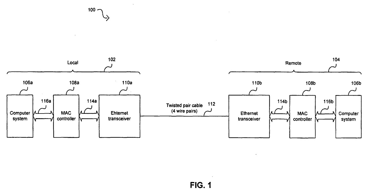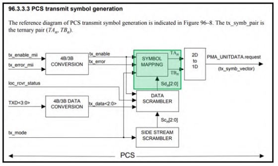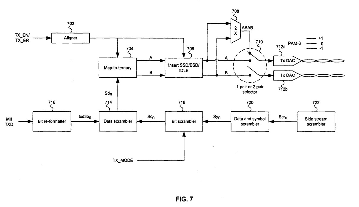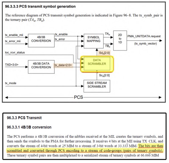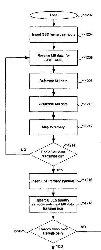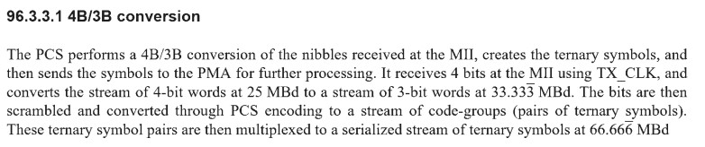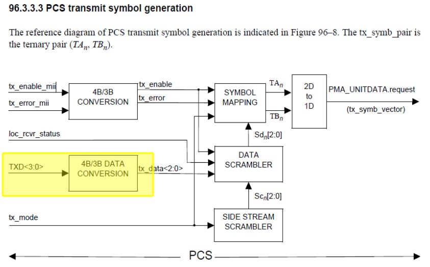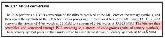 a local PHY adapted to converte [sic] Ethernet media independent interface, MII, data from a 4-bit packet stream to a 3-bit packet stream; a scrambler adapted to scrambling said 3-bit packet stream; said local PHY adapted to map of [sic] said 3-bit packet stream of MII data to one or more ternary bits streams for communication to a remote PHY over one or more twistedpair wires comprising a configuration to, during an IDLE state:
