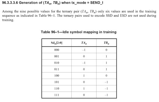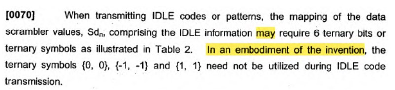 map 3-bit binary IDLE patterns of the scrambled 3-bit packet stream with a nonzero least significant bit to a zero ternary value of said one or more ternary bits streams scramble said 3-bit packet stream; ”
