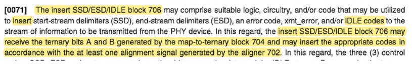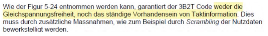 Die von den Merkmalen 11.3.1 und 11.3.2 abgedeckten IDLE-Muster dienen der Synchronisierung des Scramblers mit dem Descrambler des Empfängers (siehe Abs. [0088] des Klagepatents). Die Beklagten setzen die Synchronisierung gleich mit dem „ständigen Vorhandensein von Taktinformation“, über welches die PP5 sagt, dass der 3B2T-Code dieses nicht garantieren könne (siehe den zitierten Abschnitt aus der PP5, oben Rn 223). Die PP5 schlägt dann aber unmittelbar an dieser Stelle als Abhilfe ein Scrambling vor (siehe oben Rn 223).