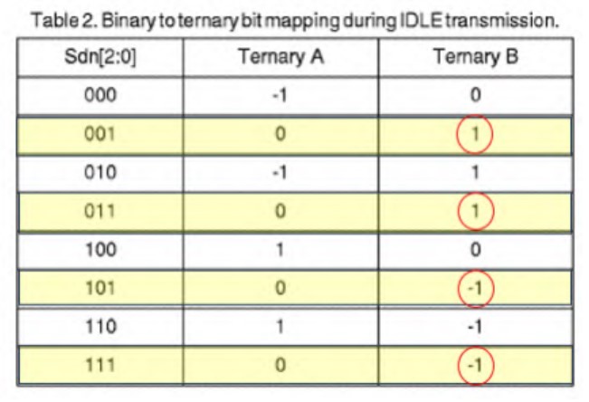 mapping 3-bit binary IDLE patterns of the scrambled 3-bit packet stream with a least significant bit of zero to a nonzero ternary value of said one or more ternary bits streams; mapping 3-bit binary IDLE patterns of the scrambled 3-bit packet stream with a nonzero least significant bit to a zero ternary value of said one or more ternary bits streams.“