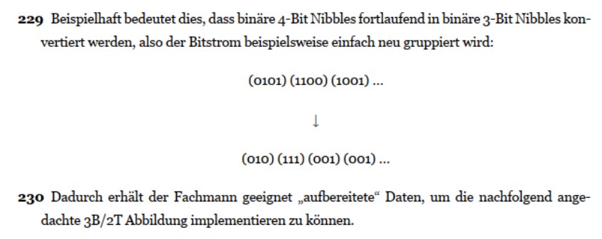 (2) Weiter gehen die Beklagten von einer mangelnden Ausführbarkeit deshalb aus, weil Merkmal 11.3 auch das Abbilden des 3-Bit-Paketstroms auf nur einen ternären Bitstrom erfasse, was aber „unweigerlich“ einen Informationsverlust zur Folge hätte, da ein ternärer Bitstrom nur drei Zustände (-1, 0, 1) kenne, während ein binärer 3-Bit-Paketstrom acht Zustände (2x2x2) darstellen könne. Es müssten daher zwingend zwei ternäre Bitströme vorliegen, die insgesamt neun Zustände (3x3) darstellen könnten.