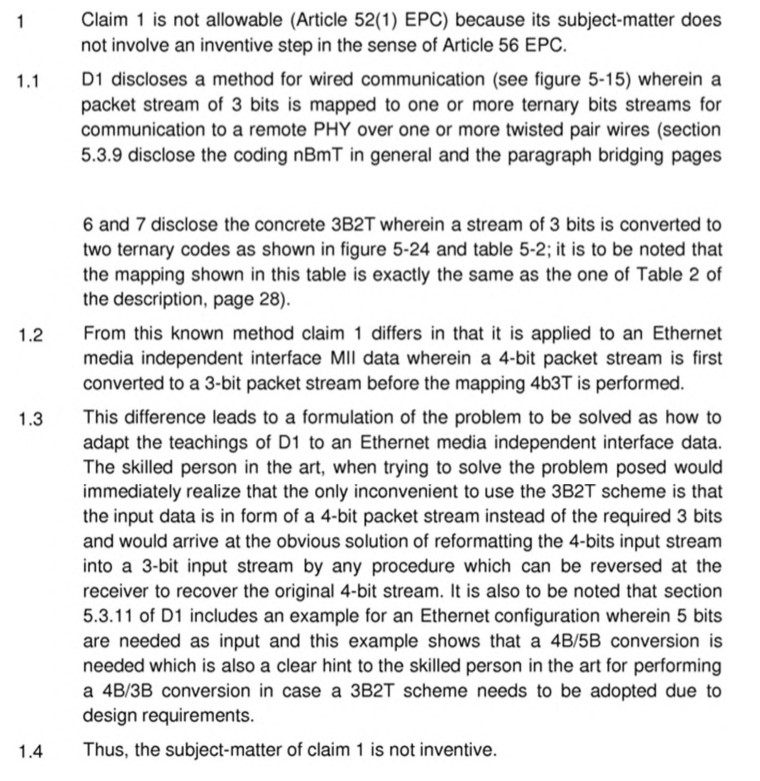 Auch aus diesem Vortrag folgt nicht eine mangelnde Ausführbarkeit. Denn wie die Klägerin unwidersprochen und plausibel dargelegt hat, kann der 3-Bit-Paketstrom auch auf „zwei ternäre Bits bzw. ein ternäres 2-Bit Symbol“ abgebildet werden, nicht nur auf ein ternäres Bit. Die Merkmale 11.3.1 und 11.3.2 lassen das zu. Zwei ternäre Bits können aber neun Werte abbilden (32).