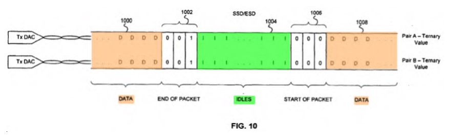 Abbilden des gescrambelten 3-Bit-Paketstroms von MII-Daten auf einen oder mehrere ternäre Bitströme zur Kommunikation an eine ferne PHY über eine oder mehrere verdrillte Leitungen, das während eines IDLE [Leerlauf]-Zustands umfasst: