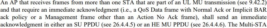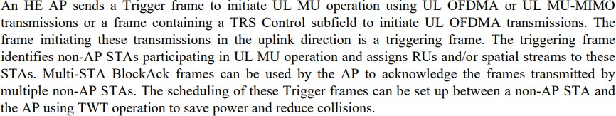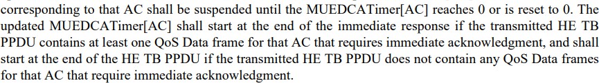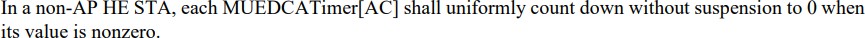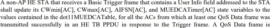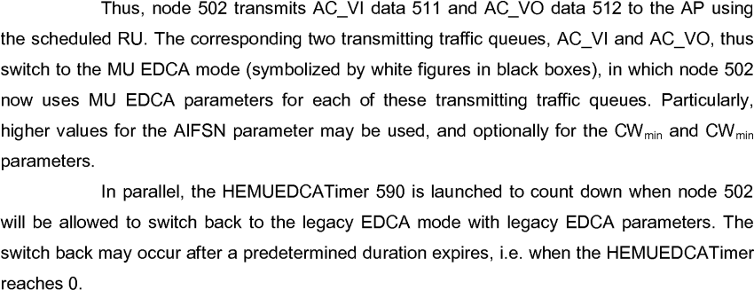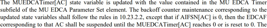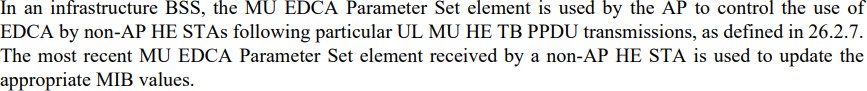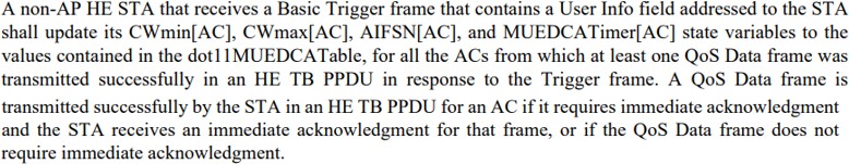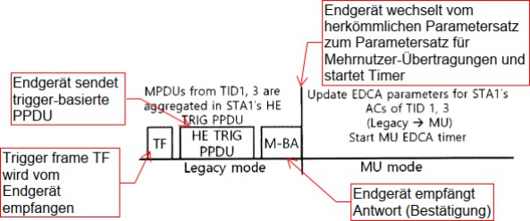 Zu diesem Zweck kennt auch die HE3 den Wechsel vom herkömmlichen konkurrierenden Zugriffsmodus EDCA zu einem anderen EDCA-Modus im Mehrbenut-zer-Kontext („MU EDCA mode“) und zurück, separat für jede verwendete Zugriffskategorie.