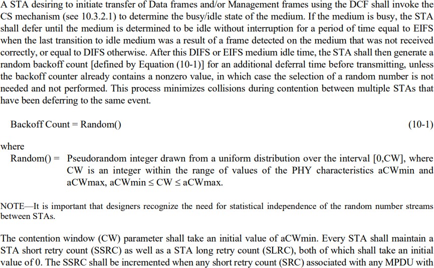 calculating a random integer value within a contention window, CW; setting a backoff timer based on the random integer value;